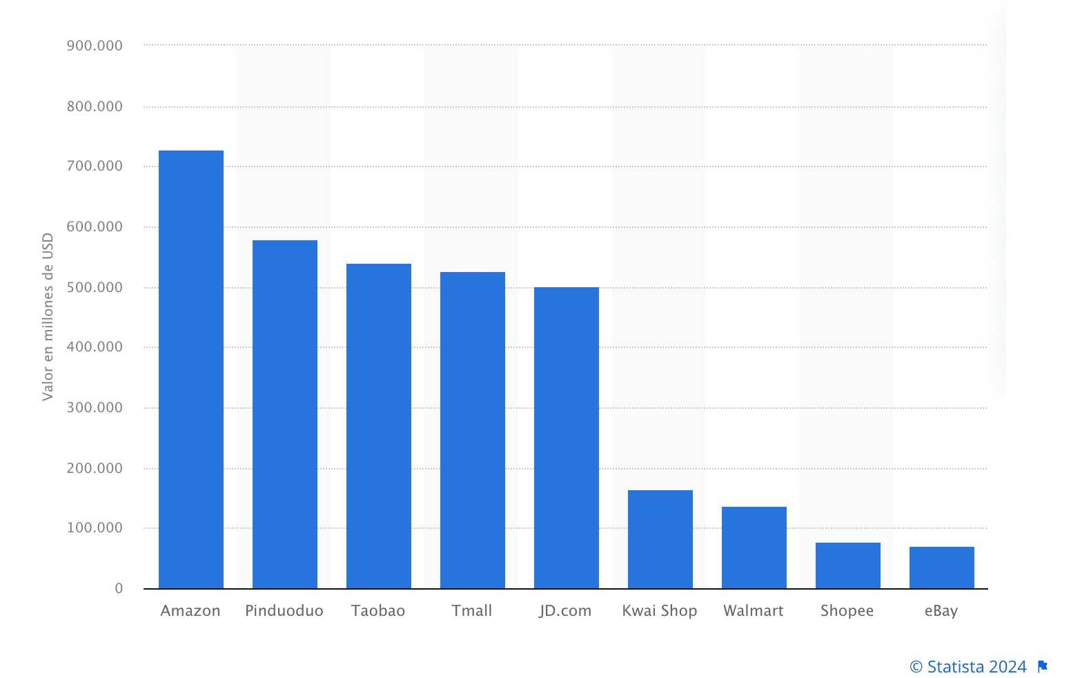Esta situación no llama especialmente la atención si se considera que se trata asimismo del marketplace online con mayor capitalización bursátil. La segunda y la tercera posición la ocuparon, respectivamente, los asiáticos Pinduoduo y Taobao, con un GMV superior a los 540.000 millones de dólares en ambos casos.