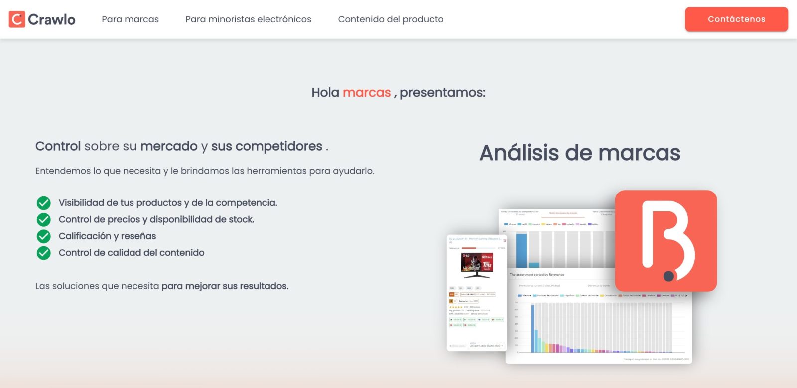 Herramientas como Brands Analytics desarrollada por Crawlo atacan este problema. En este caso lo hace desde un enfoque de usabilidad bien conseguida, donde la información se puede extraer de manera sencilla y es accionable, evitando uno de los problemas que este tipo de herramientas suelen tener y las hace morir en el cajón, su extrema complejidad tanto de uso como de informe de resultados. Brands Analytics facilita el entendimiento de los datos al disponer de un índice que aglutina diferentes criterios para dar una imagen sencilla y comparable de la visibilidad de los productos de una marca, en global, por categorías y por retailer, comparado además con la competencia que se defina.
