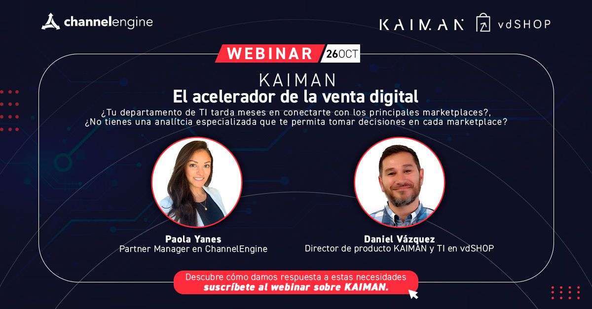 El próximo Jueves 26 de Octubre de 16:00 a 16:45 horas, se celebrará el webinar: Descubre KAIMAN el acelerador de la venta digital y la potente integración que tiene con ChannelEngine para poder montar un ecommerce en 10 minutos y vender en más de 700 canales digitales en pocos días.